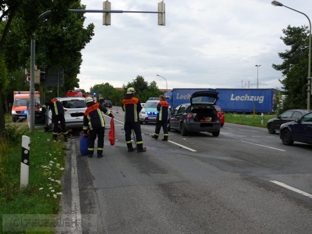 Am frühen Montag morgen ereignete sich Auf der Augsburgerstr. bei der Kreuzung zur Lechwiesenstr. ein Verkehrsunfall. Die Fahrbahn war durch Fahrzeugteile und Betriebsstoffe verschmutzt. Die Feuerwehr reinigte die Straße und übernahm die Verkehrsregelung.