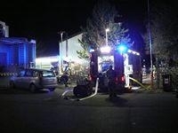 An einem Wohnhaus brannte ein Holzstapel, das Holz wurde mit einem Schaumteppich abgedeckt.