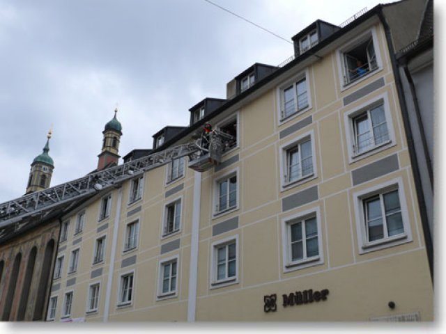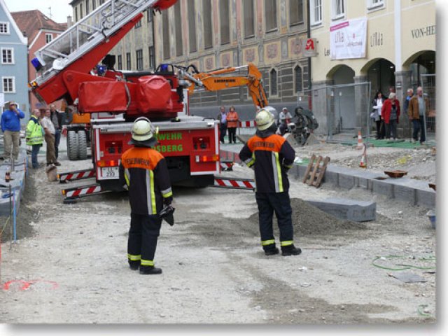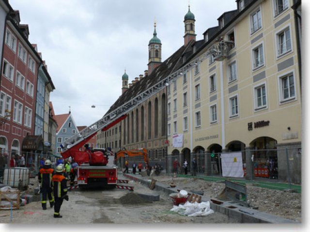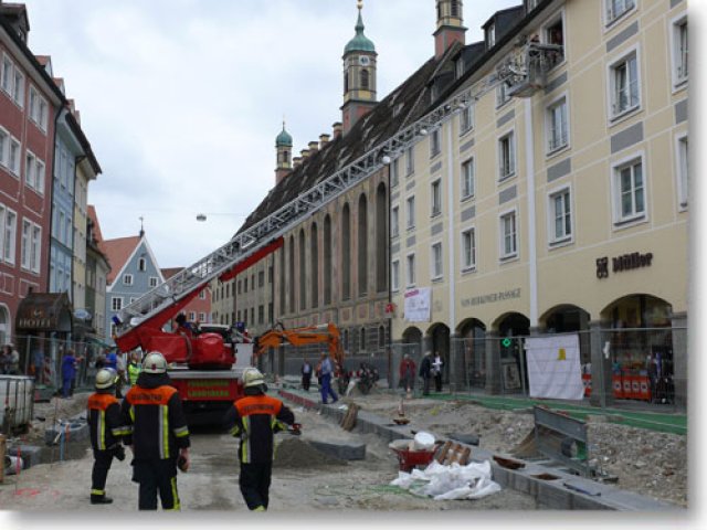 Am Donnerstag gegen Mittag musste die Feuerwehr Landsberg zu einer Personenbergung in die Herkomer Str. ausrücken. Eine junge Frau musste mittels Drehleiter aus dem dritten Stock des Ärztehauses geborgen werden. Durch die tatkräftige Mithilfe der Mitarbeiter der Baufirma war ein Durchkommen auf der Baustelle des Hauptplatzes ohne Probleme möglich. (ts)