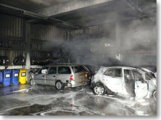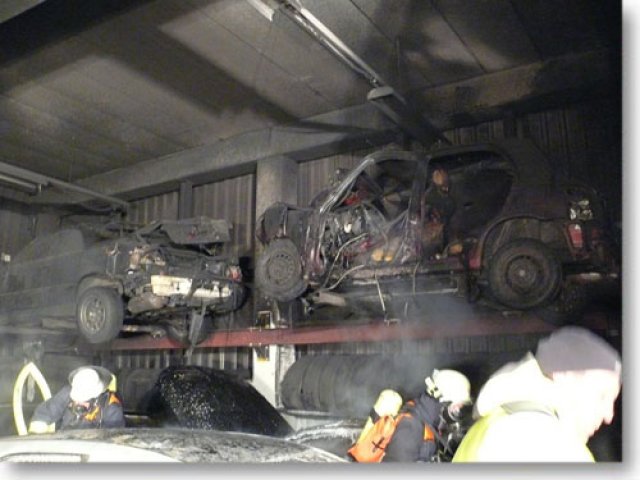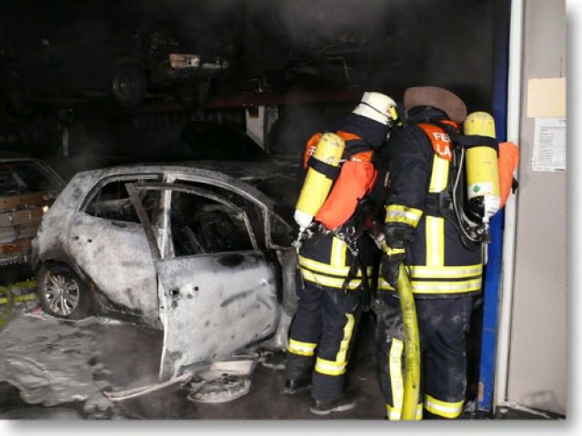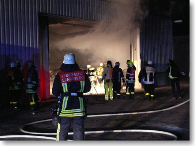 In der Nacht vom Donnerstag geriet aus noch ungeklärten Gründen ein PKW, der zuvor bei einem Verkehrsunfall abgeschleppt wurde, in einer Abschlepphalle in Landsberg in Brand. Die Feuerwehren Landsberg mit allen Ortsteilen, die Feuerwehr Kaufering und die Unterstützungsgruppe aus Dießen wurden zu diesem Brand alarmiert. Die Erkundung wurde durch den Stadtbrandinspektor aus Landsberg durchgeführt. Der Erstangriff erfolgte durch die Feuerwehr Landsberg mittels eines Atemschutztrupps. Dieser brachte das Feuer schnell unter Kontrolle und konnte nach 10 Minuten "Feuer aus" melden. Anschließend wurde die Halle mittels Hochleistungslüfter belüftet. Der Unfall-PKW sowie 3 weitere Fahrzeuge brannten völlig aus. Der Gesamtschaden wurde von der Polizei auf ca. 250000 Euro geschätzt. (ts)