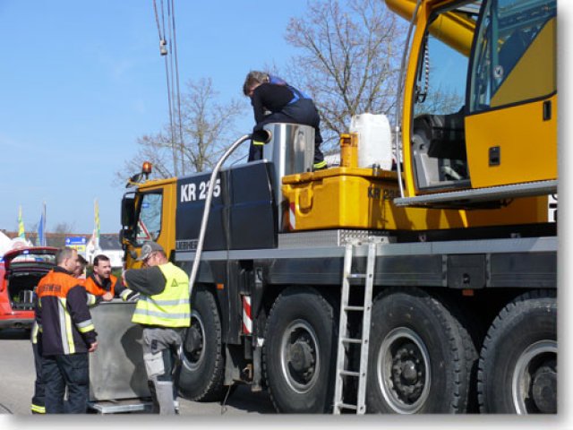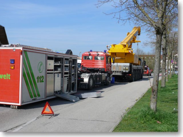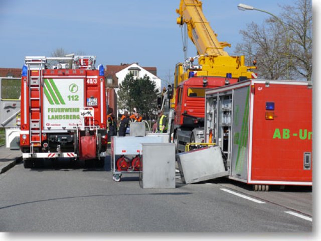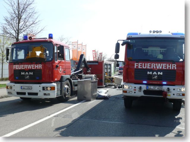 Am Mittwoch Vormittag wurde die Feuerwehr Landsberg zu einem Ölunfall in die Carl-Friedrich-Benz-Str. gerufen. Ein Hydraulikschlauch eines schweren Kranwagens war geplatzt. Da der Schaden an Ort und Stelle repariert wurde, musste die Feuerwehr das Hydrauliköl des Krans abpumpen. Der Ölschaden, der auf der Straße entstand, wurde durch die Feuerwehr gebunden und die Straße mittels Reinigungsmaschine eines Bergungsunternehmens gewaschen. Die Carl-Friedrich-Benz-Str. musste zwischen der Einfahrt Augsburger Str. und der Kreuzung Lechfeldstr. zeitweise komplett gesperrt werden. (ts)