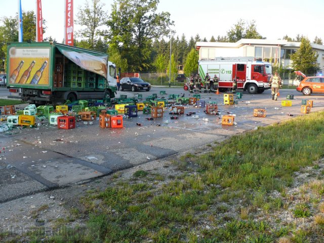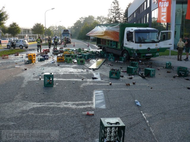 Am Freitag in der früh kam es in der Celsiusstr. zu einem Verkehrsunfall. Ein PKW prallte dort in einen entgegenkommenden Getränkelaster. Durch den aufprall verteilte sich die Ladung des LKW auf der Straße. Die Feuerwehr regelte den Verkehr und reinigte mit Hilfe der Kehrmaschine des Städtischen Bauhofs die Fahrbahn.
