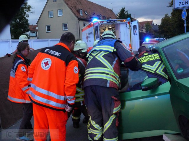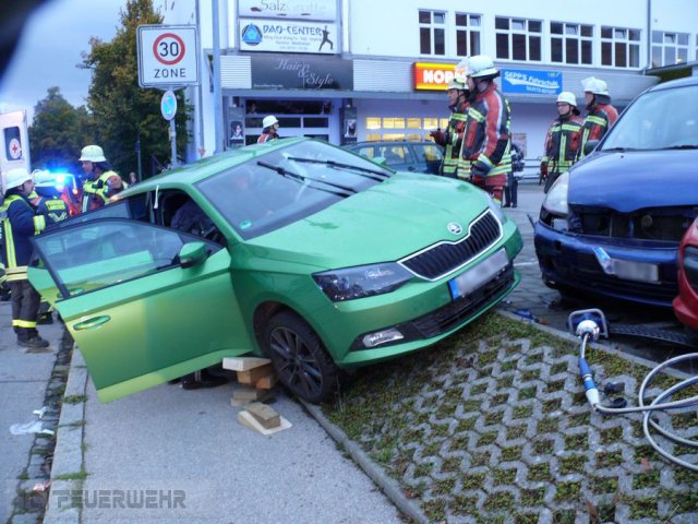 Aus noch ungeklärter Ursache kam ein PKW auf höhe des Supermarkts in der Johann Schmidt Str. von der Fahrbahn ab und fuhr auf eine schräge Betonmauer die sich neben dem Gehweg befand. Beide Insassen mussten von der Feuerwehr befreit werden.