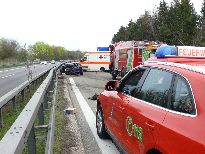 Ein PKW aus Richtung Lindau kommend, prallte kurz nach der Rastanlage Lechwiesen gegen die rechte Leitplanke. Der Motorblock wurde durch den aufprall herausgerissen. Das Fahrzeug kam auf der linken Fahrspur an der Leitplanke zum stehen.