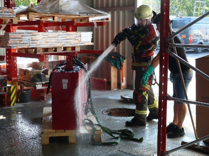In einem Betrieb ist eine kleine Menge Batteriesäure ausgelaufen, die Feuerwehr beseitigte den auslaufenden Stoff.