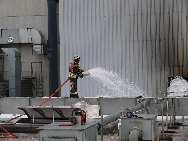 In einer Bandweberei kam es am Montagmorgen zu einem Maschinenbrand. Das Feuer brannte durch die darüberliegende Decke und die Lüftungsanlage. Mit mehreren Trupps unter Atemschutz war das Feuer schnell gelöscht, ein Teil der Fassade musste mit einer Multicut geöffnet werden um es auf Glutnester zu kontrollieren.