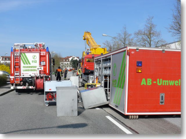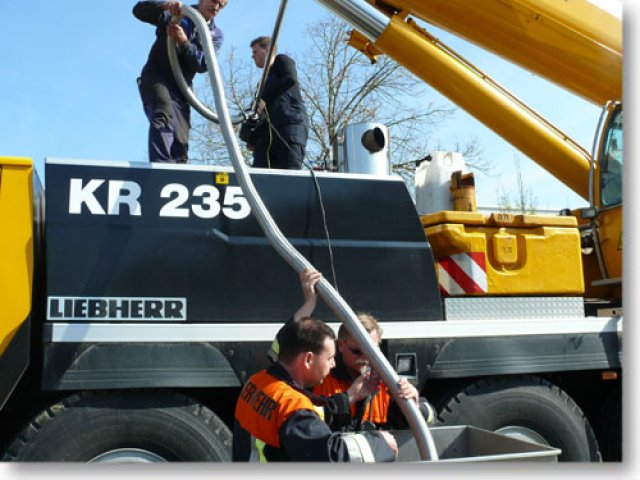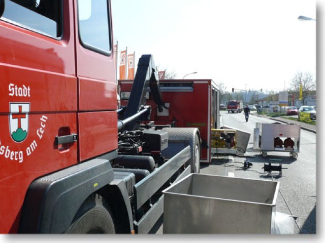 Am Mittwoch Vormittag wurde die Feuerwehr Landsberg zu einem Ölunfall in die Carl-Friedrich-Benz-Str. gerufen. Ein Hydraulikschlauch eines schweren Kranwagens war geplatzt. Da der Schaden an Ort und Stelle repariert wurde, musste die Feuerwehr das Hydrauliköl des Krans abpumpen. Der Ölschaden, der auf der Straße entstand, wurde durch die Feuerwehr gebunden und die Straße mittels Reinigungsmaschine eines Bergungsunternehmens gewaschen. Die Carl-Friedrich-Benz-Str. musste zwischen der Einfahrt Augsburger Str. und der Kreuzung Lechfeldstr. zeitweise komplett gesperrt werden. (ts)