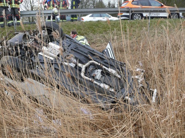 Aus noch ungeklärter Ursache kam ein PKW von der Fahrbahn ab. Das Fahrzeug prallte in die Leitplanke und überschlug sich und blieb anschließend in einem Feld neben der Autobahn liegen. Die Feuerwehr übernahm die reinigung der Fahrbahn und die Verkehrslenkung.