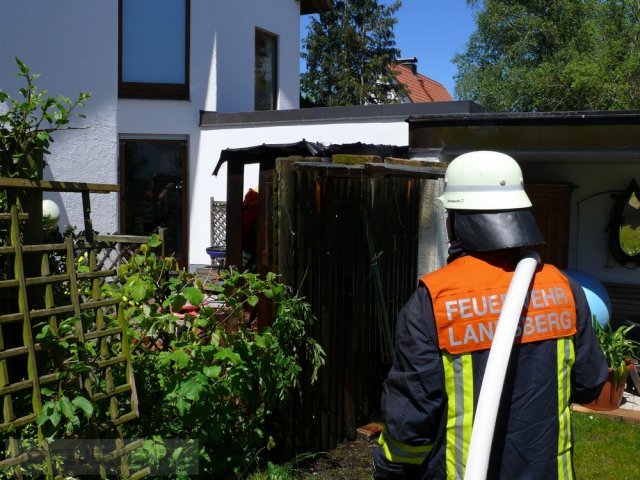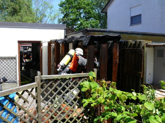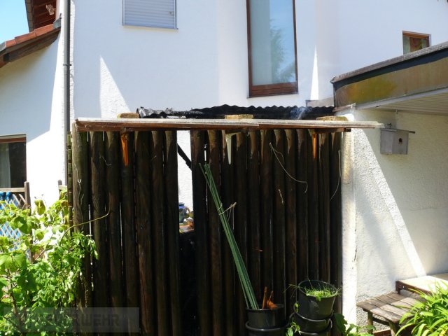 Die Feuerwehr wurde zu einem Wohnhausbrand alarmiert. Nach der Erkundung stellte sich heraus, dass es ein Holzunterstand war, der in Brand geraten war.