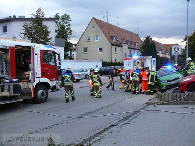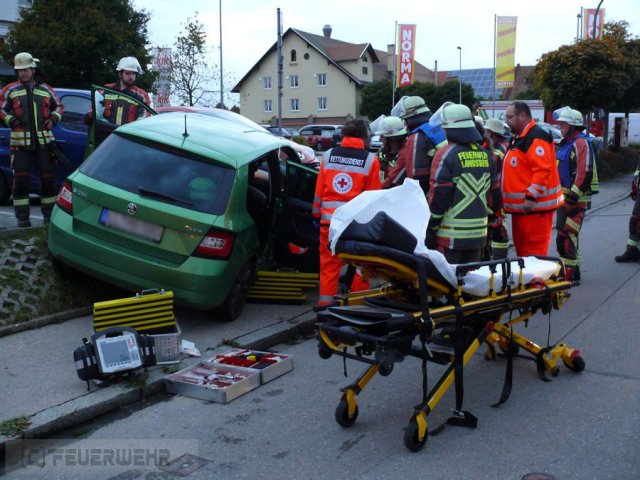 Aus noch ungeklärter Ursache kam ein PKW auf höhe des Supermarkts in der Johann Schmidt Str. von der Fahrbahn ab und fuhr auf eine schräge Betonmauer die sich neben dem Gehweg befand. Beide Insassen mussten von der Feuerwehr befreit werden.